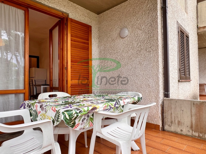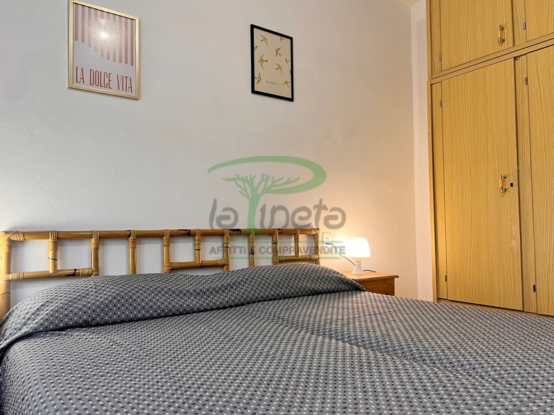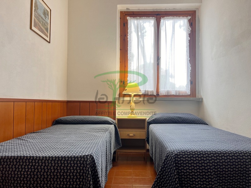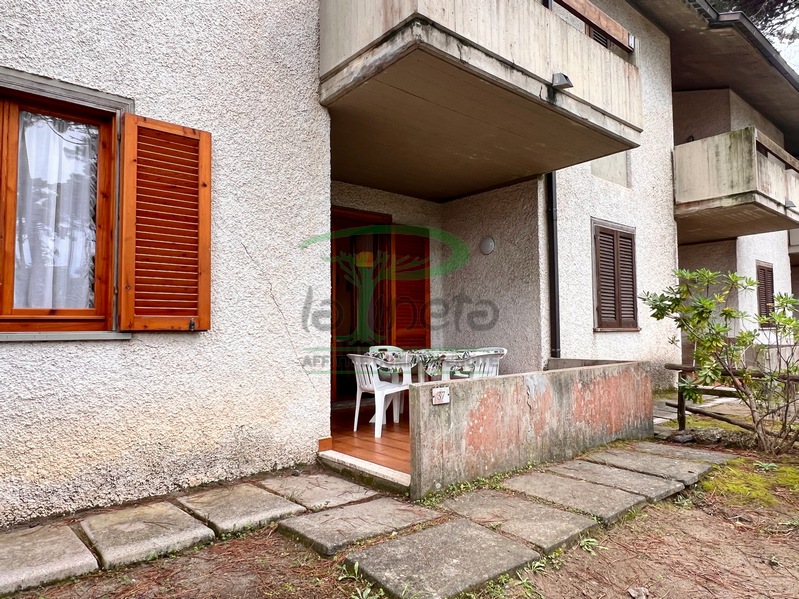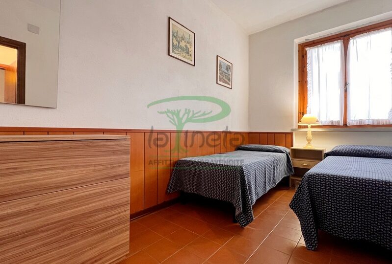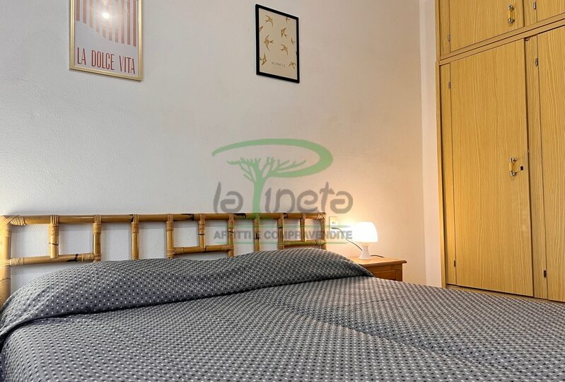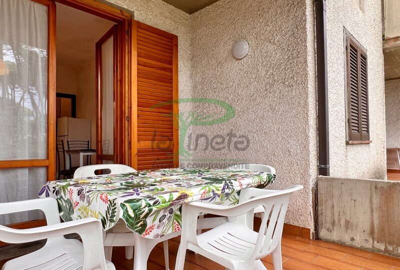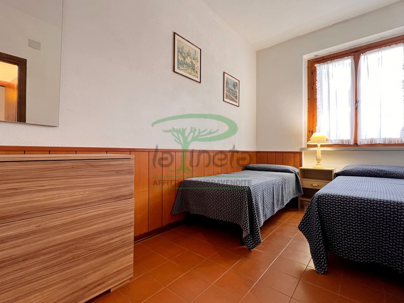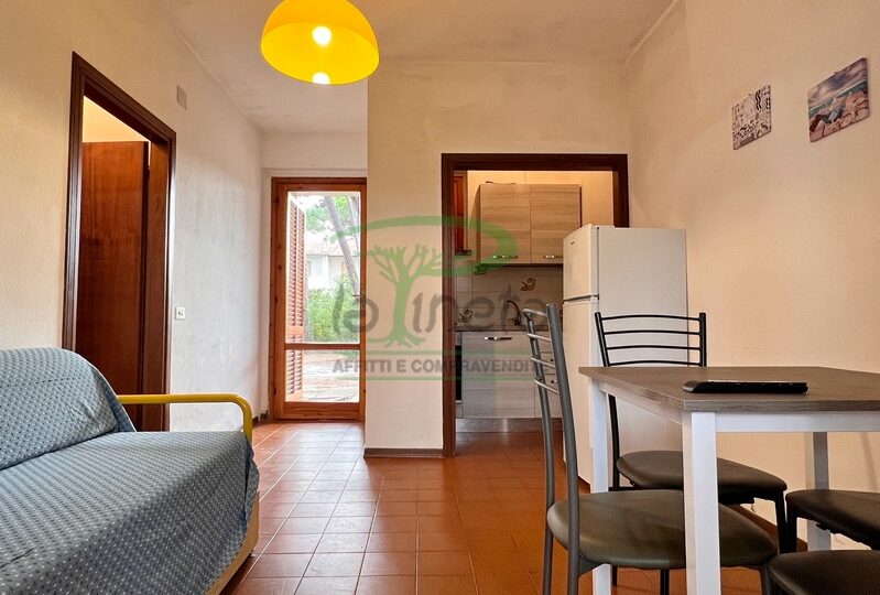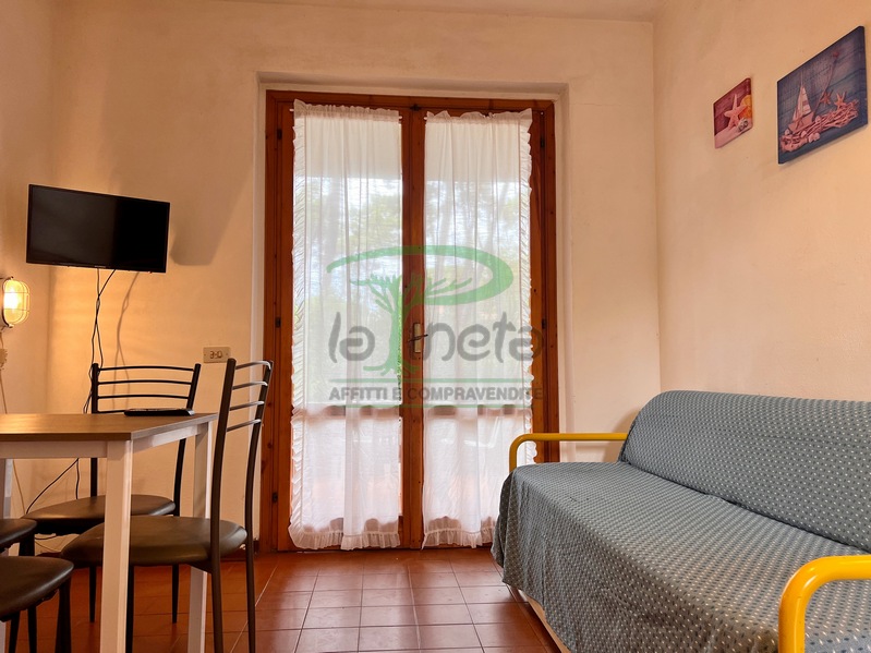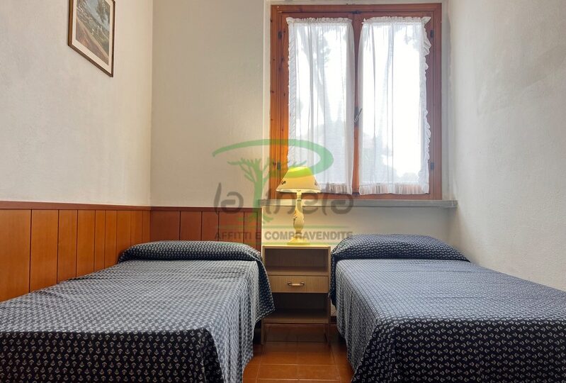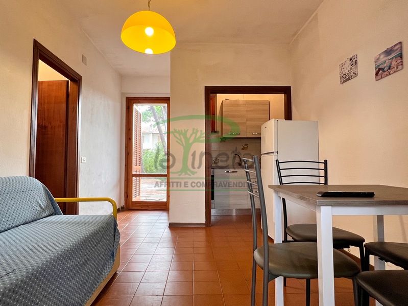 Trilocale piano terra con giardino, 350 metri dalla spiaggia. Soggiorno con un posto letto, angolo cottura, camera matrimoniale, camera con due letti singoli, bagno con doccia. tv, lavatrice, parcheggio. No Biancheria.