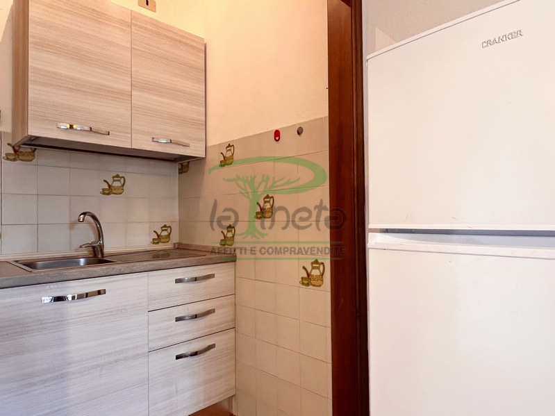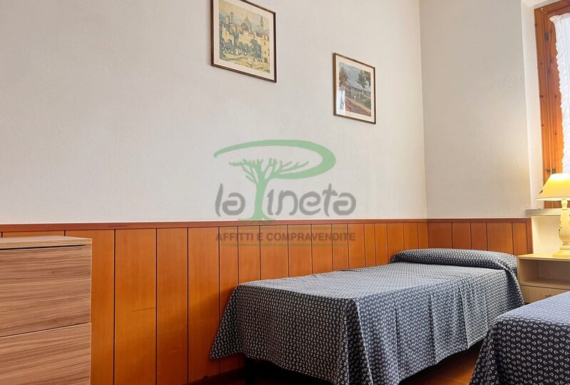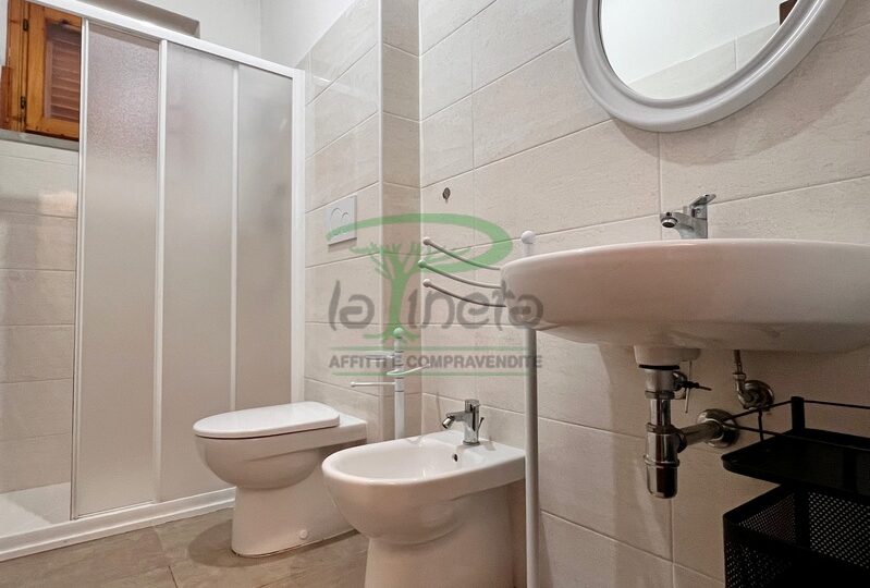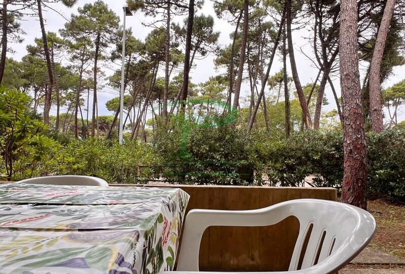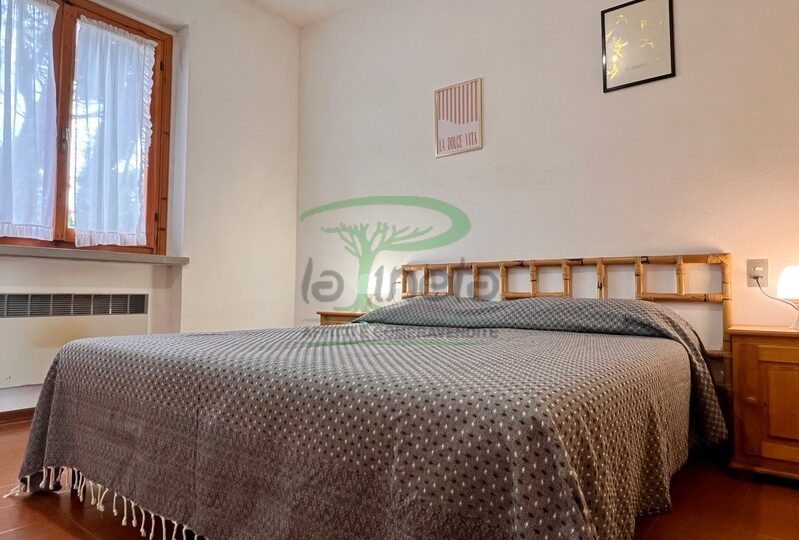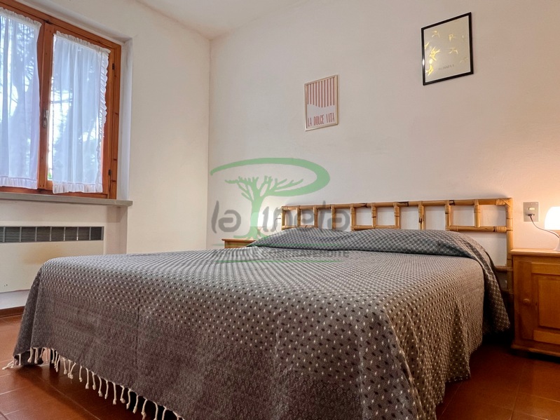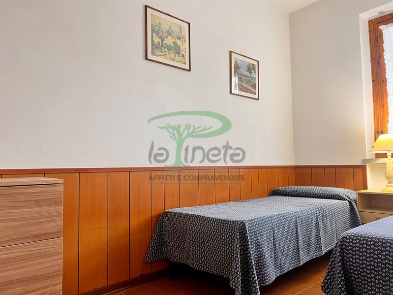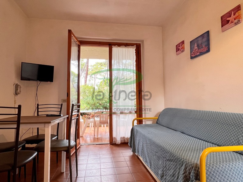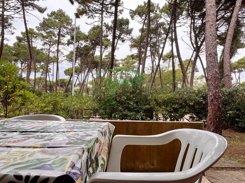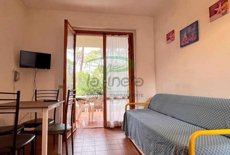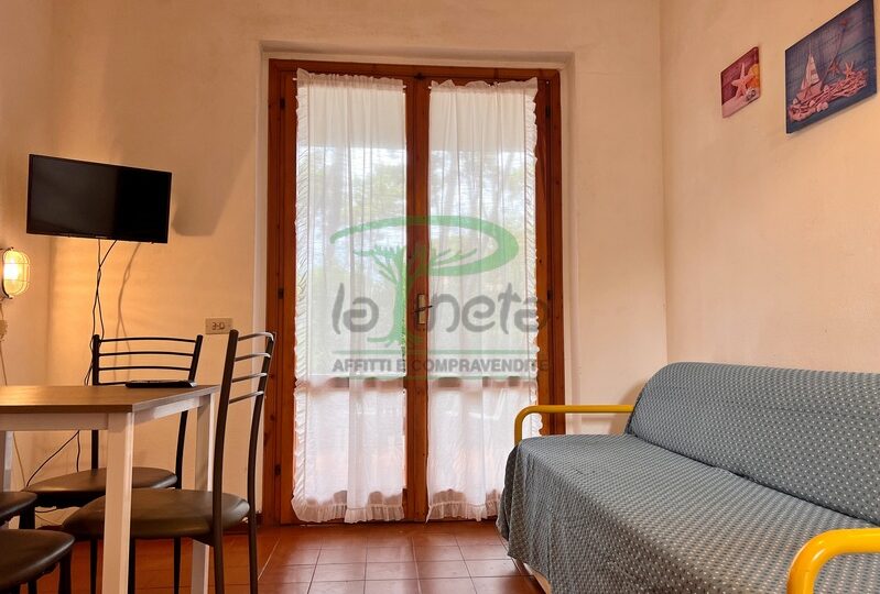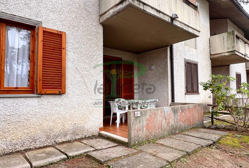 Trilocale piano terra con giardino, 350 metri dalla spiaggia. Soggiorno con un posto letto, angolo cottura, camera matrimoniale, camera con due letti singoli, bagno con doccia. tv, lavatrice, parcheggio. No Biancheria.