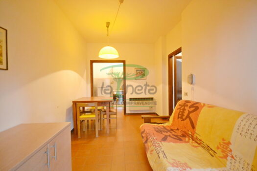 Trilocale al piano terra con spazio esterno non recintato, composto di soggiorno con divano letto, angolo cottura, due camere da letto e bagno con doccia. tv lavatrice. No biancheria.